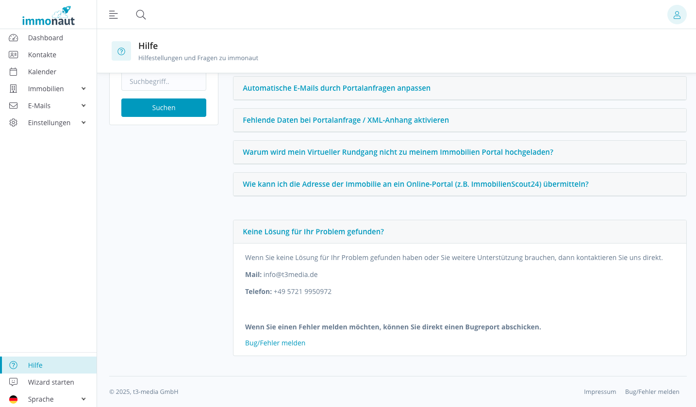 Links unten finden Sie unter dem Punkt „Hilfe“ die Möglichkeit, ein FAQ zu wichtigen Fragen einzusehen. Hier werden häufig gestellte Fragen in einem Aufklappmenü beantwortet.